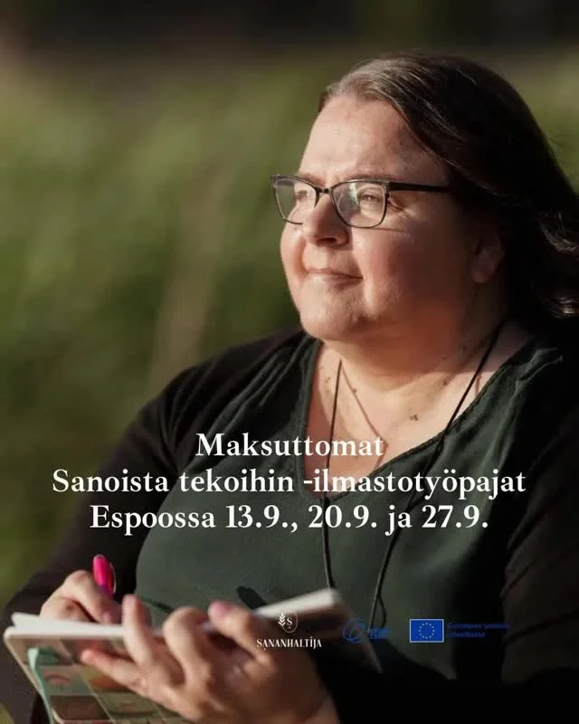 I gained the tools for my profession by training as a creative writing instructor at Snellman Summer University in Kuopio, Finland, from 2015 to 2016, and as a biblio/poetry therapy facilitator at the University of Helsinki Center for Continuing Education HY+ from 2018 to 2019. At the moment, I'm studying to become a biblio/poetry therapist at the same institution, graduating in December 2024.